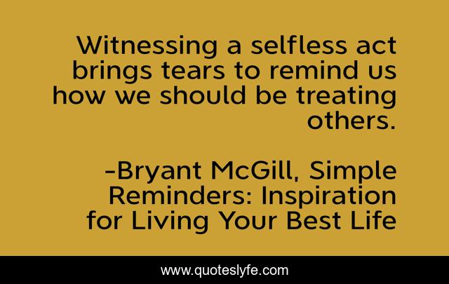 This page presents the quote "Witnessing a selfless act brings tears to remind us how we should be treating others.". Author of this quote is Bryant McGill, Simple Reminders: Inspiration for Living Your Best Life. This quote is about selflessness, treating, tears, reminders, witnessing,.