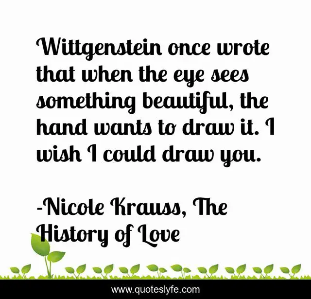 This page presents the quote "Wittgenstein once wrote that when the eye sees something beautiful, the hand wants to draw it. I wish I could draw you.". Author of this quote is Nicole Krauss, The History of Love. .