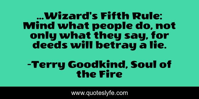 This page presents the quote "...Wizard's Fifth Rule: Mind what people do, not only what they say, for deeds will betray a lie.". Author of this quote is Terry Goodkind, Soul of the Fire. This quote is about fantasy, wizard-s-rules, zedd,.