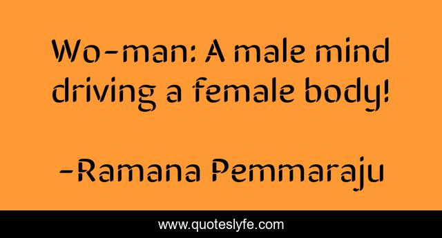 This page presents the quote "Wo-man: A male mind driving a female body!". Author of this quote is Ramana Pemmaraju. This quote is about imbalance, woman, equality, dominance, man,.