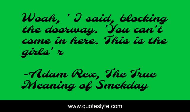 This page presents the quote "Woah, ' I said, blocking the doorway. 'You can't come in here. This is the girls' r". Author of this quote is Adam Rex, The True Meaning of Smekday. This quote is about alien, gender, humor, politeness,.