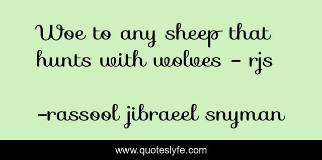 This page presents the quote "Woe to any sheep that hunts with wolves - rjs". Author of this quote is rassool jibraeel snyman. This quote is about politics, philosophical, philosophy, political, warning,.