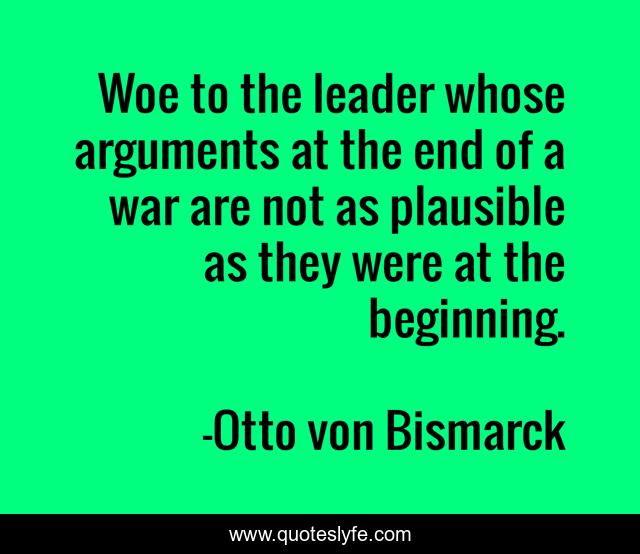 This page presents the quote "Woe to the leader whose arguments at the end of a war are not as plausible as they were at the beginning.". Author of this quote is Otto von Bismarck. .