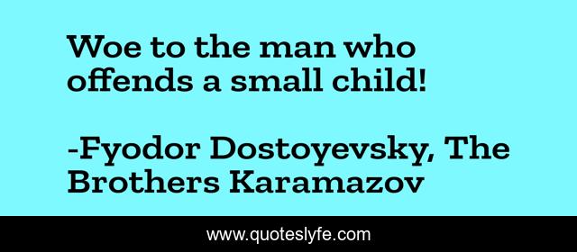This page presents the quote "Woe to the man who offends a small child!". Author of this quote is Fyodor Dostoyevsky, The Brothers Karamazov. This quote is about mistreatment, injury, children, abuse, small-children,.