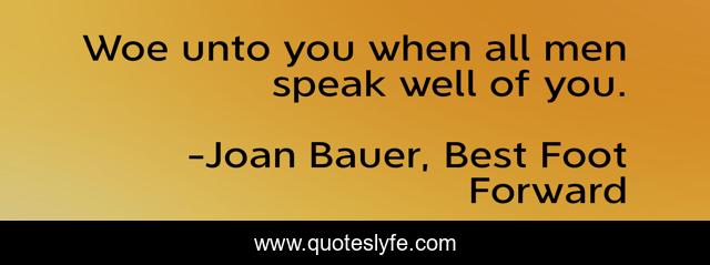 This page presents the quote "Woe unto you when all men speak well of you.". Author of this quote is Joan Bauer, Best Foot Forward. This quote is about woe, living, men, opinions,.