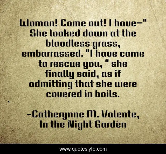 This page presents the quote "Woman! Come out! I have—" She looked down at the bloodless grass, embarrassed. "I have come to rescue you, " she finally said, as if admitting that she were covered in boils.". Author of this quote is Catherynne M. Valente, In the Night Garden. This quote is about humor, rescuing, witches,.