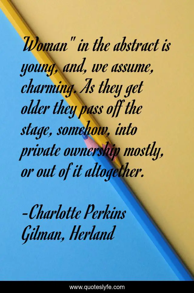 "Charlotte Perkins Gilman, Herland Quotes." Quoteslyfe.com, 2025. Sun. 07 Dec. 2025. <https://www.quoteslyfe.com/quote/Woman-in-the-abstract-is-young-and-58745>.
