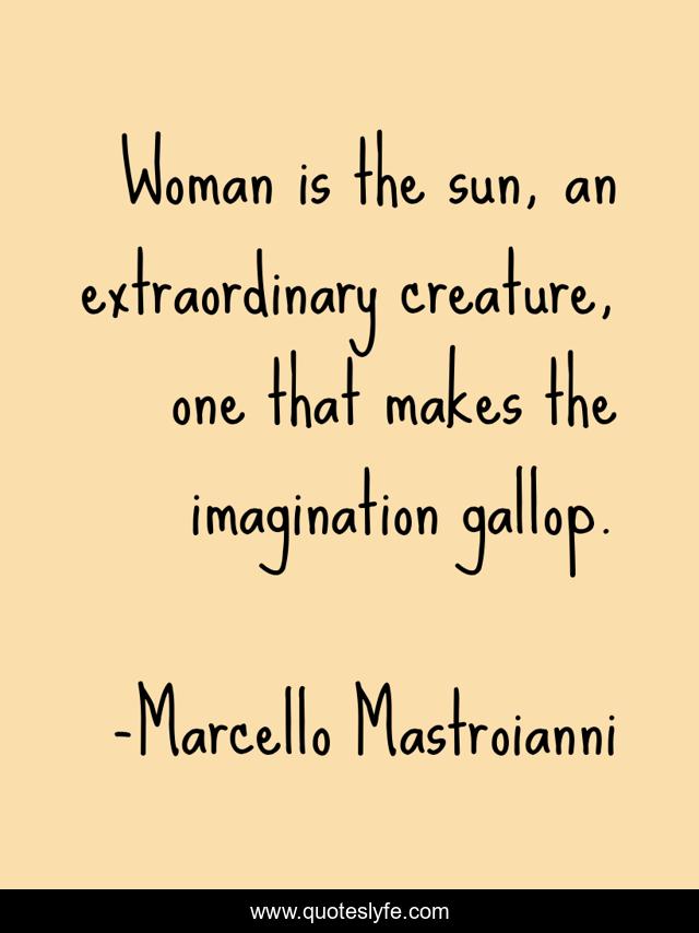 This page presents the quote "Woman is the sun, an extraordinary creature, one that makes the imagination gallop.". Author of this quote is Marcello Mastroianni. This quote is about sun, woman, extraordinary,.