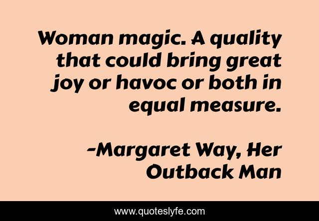 This page presents the quote "Woman magic. A quality that could bring great joy or havoc or both in equal measure.". Author of this quote is Margaret Way, Her Outback Man. This quote is about magic, women,.