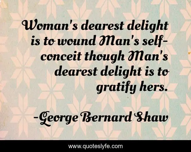 This page presents the quote "Woman's dearest delight is to wound Man's self-conceit though Man's dearest delight is to gratify hers.". Author of this quote is George Bernard Shaw. .
