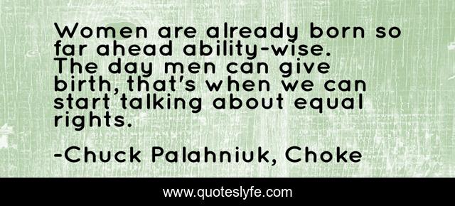 This page presents the quote "Women are already born so far ahead ability-wise. The day men can give birth, that's when we can start talking about equal rights.". Author of this quote is Chuck Palahniuk, Choke. This quote is about humor, feminism,.