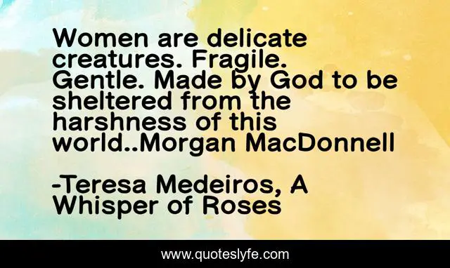 This page presents the quote "Women are delicate creatures. Fragile. Gentle. Made by God to be sheltered from the harshness of this world..Morgan MacDonnell". Author of this quote is Teresa Medeiros, A Whisper of Roses. This quote is about god, women,.
