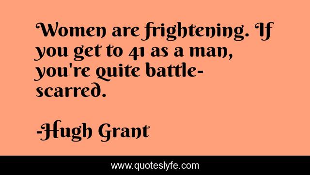 This page presents the quote "Women are frightening. If you get to 41 as a man, you're quite battle-scarred.". Author of this quote is Hugh Grant. This quote is about women are, man,.