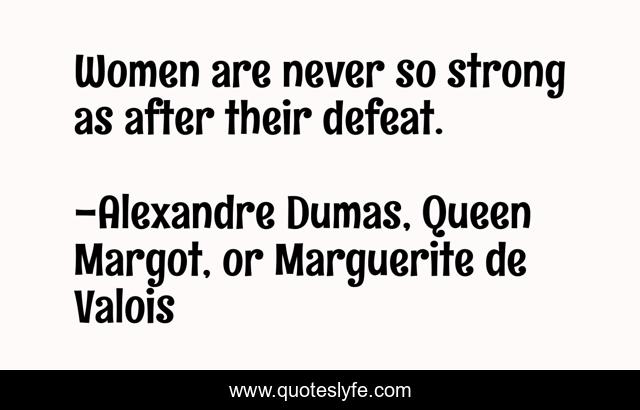 This page presents the quote "Women are never so strong as after their defeat.". Author of this quote is Alexandre Dumas, Queen Margot, or Marguerite de Valois. This quote is about perseverance, empowerment, strength, defeat, women,.