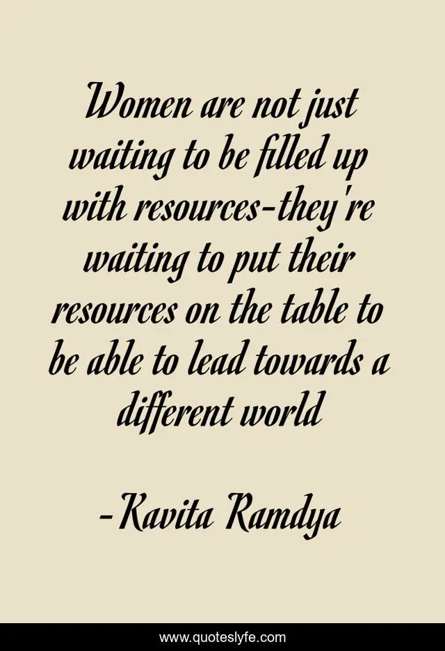 This page presents the quote "Women are not just waiting to be filled up with resources-they're waiting to put their resources on the table to be able to lead towards a different world". Author of this quote is Kavita Ramdya. This quote is about contribution, leadership, women,.