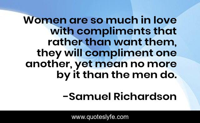 This page presents the quote "Women are so much in love with compliments that rather than want them, they will compliment one another, yet mean no more by it than the men do.". Author of this quote is Samuel Richardson. This quote is about men, love, affection,.