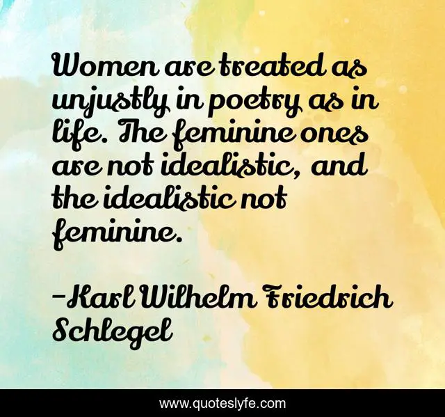 This page presents the quote "Women are treated as unjustly in poetry as in life. The feminine ones are not idealistic, and the idealistic not feminine.". Author of this quote is Karl Wilhelm Friedrich Schlegel. This quote is about feminine, life, women,.