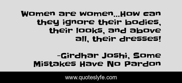 This page presents the quote "Women are women…How can they ignore their bodies, their looks, and above all, their dresses!". Author of this quote is Girdhar Joshi, Some Mistakes Have No Pardon. This quote is about bodies, dresses, women,.
