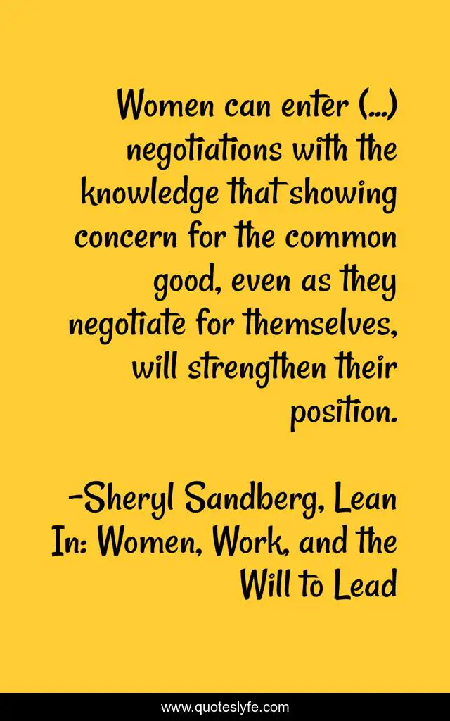 This page presents the quote "Women can enter (...) negotiations with the knowledge that showing concern for the common good, even as they negotiate for themselves, will strengthen their position.". Author of this quote is Sheryl Sandberg, Lean In: Women, Work, and the Will to Lead. This quote is about gender-equality, leadership,.