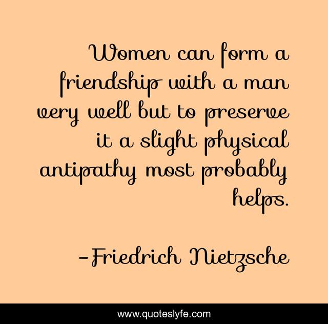 This page presents the quote "Women can form a friendship with a man very well but to preserve it a slight physical antipathy most probably helps.". Author of this quote is Friedrich Nietzsche. .