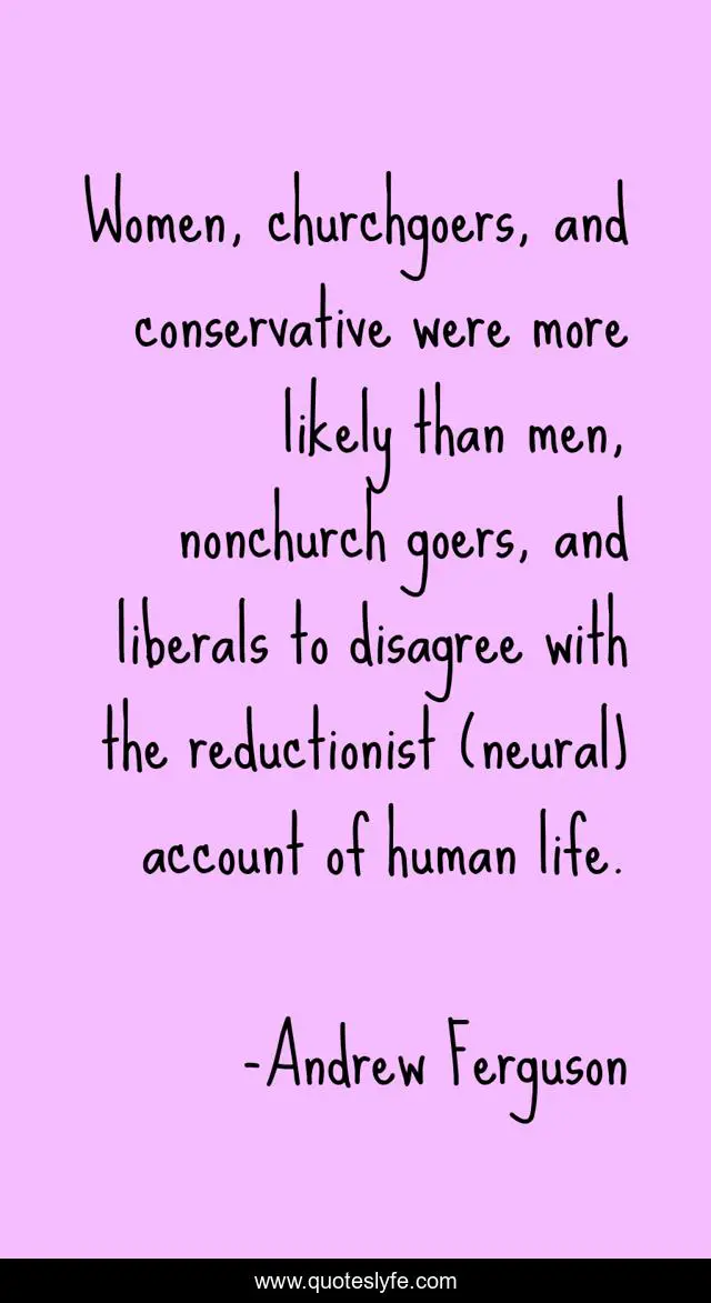 This page presents the quote "Women, churchgoers, and conservative were more likely than men, nonchurch goers, and liberals to disagree with the reductionist (neural) account of human life.". Author of this quote is Andrew Ferguson. This quote is about determinism, evolution, creation, neurology, individualism,.