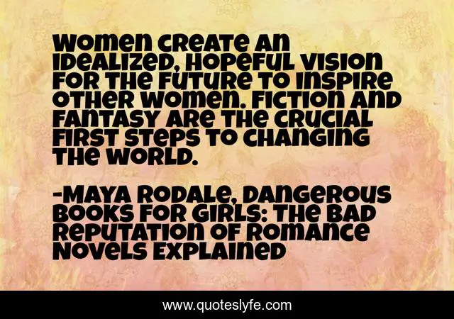 This page presents the quote "Women create an idealized, hopeful vision for the future to inspire other women. Fiction and fantasy are the crucial first steps to changing the world.". Author of this quote is Maya Rodale, Dangerous Books for Girls: The Bad Reputation of Romance Novels Explained. This quote is about fiction, novels, women,.