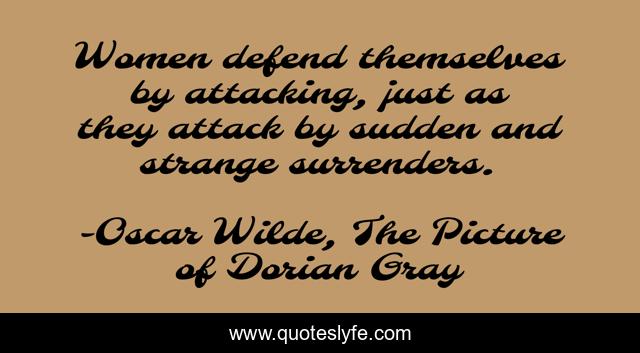 This page presents the quote "Women defend themselves by attacking, just as they attack by sudden and strange surrenders.". Author of this quote is Oscar Wilde, The Picture of Dorian Gray. .