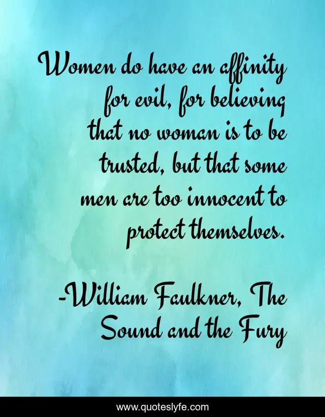 This page presents the quote "Women do have an affinity for evil, for believing that no woman is to be trusted, but that some men are too innocent to protect themselves.". Author of this quote is William Faulkner, The Sound and the Fury. This quote is about innocence, trust, evil, men, women,.
