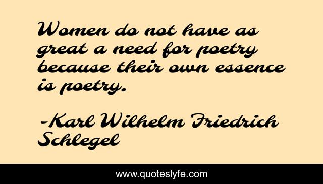 This page presents the quote "Women do not have as great a need for poetry because their own essence is poetry.". Author of this quote is Karl Wilhelm Friedrich Schlegel. This quote is about need, great, women,.