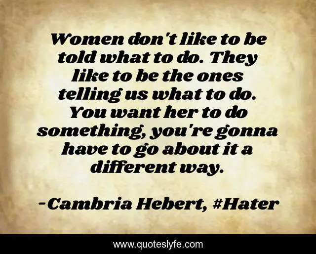 "Cambria Hebert, #Hater Quotes." Quoteslyfe.com, 2025. Sat. 06 Dec. 2025. <https://www.quoteslyfe.com/quote/Women-don-t-like-to-be-told-12962>.
