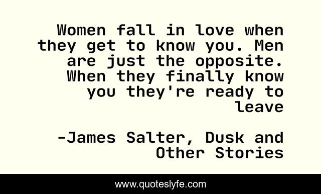 This page presents the quote "Women fall in love when they get to know you. Men are just the opposite. When they finally know you they're ready to leave". Author of this quote is James Salter, Dusk and Other Stories. This quote is about men, women,.