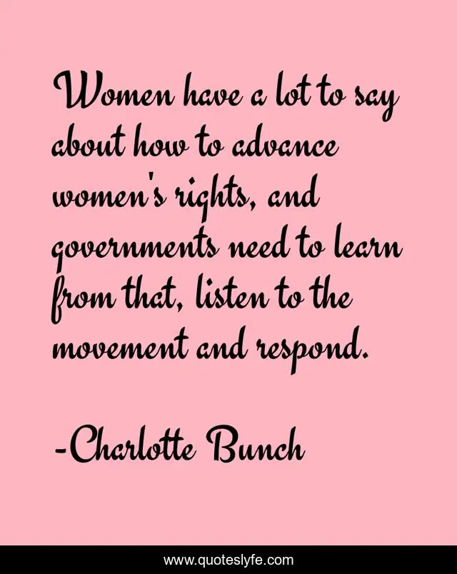 This page presents the quote "Women have a lot to say about how to advance women's rights, and governments need to learn from that, listen to the movement and respond.". Author of this quote is Charlotte Bunch. This quote is about women, learn, listen,.