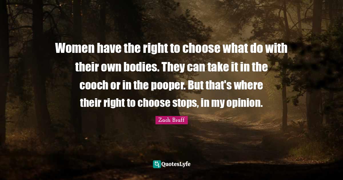 This page presents the quote "Women have the right to choose what do with their own bodies. They can take it in the cooch or in the pooper. But that's where their right to choose stops, in my opinion.". Author of this quote is Zach Braff. This quote is about opinion, women, body,.