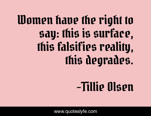 This page presents the quote "Women have the right to say: this is surface, this falsifies reality, this degrades.". Author of this quote is Tillie Olsen. This quote is about right, reality,.