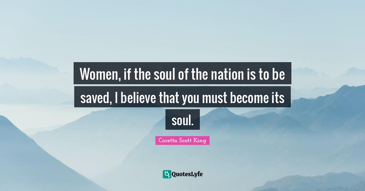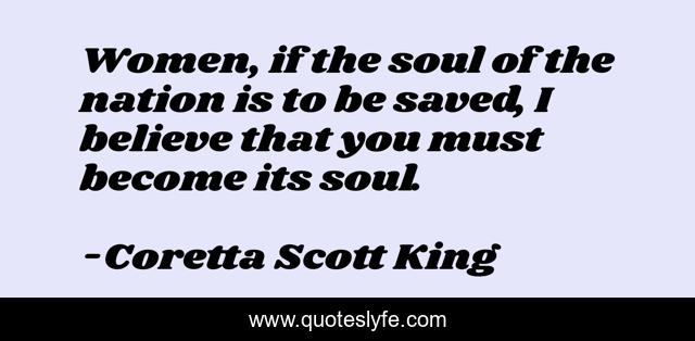 This page presents the quote "Women, if the soul of the nation is to be saved, I believe that you must become its soul.". Author of this quote is Coretta Scott King. This quote is about i believe, believe, soul,.