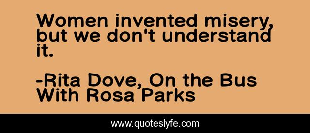 This page presents the quote "Women invented misery, but we don't understand it.". Author of this quote is Rita Dove, On the Bus With Rosa Parks. This quote is about misery, life, understanding, poetry, women,.
