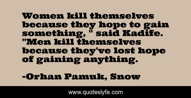 This page presents the quote "Women kill themselves because they hope to gain something, " said Kadife. "Men kill themselves because they've lost hope of gaining anything.". Author of this quote is Orhan Pamuk, Snow. .