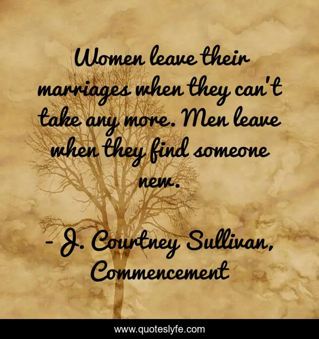 This page presents the quote "Women leave their marriages when they can't take any more. Men leave when they find someone new.". Author of this quote is J. Courtney Sullivan, Commencement. This quote is about leave, marriage, men-and-women, gender-stereotypes,.