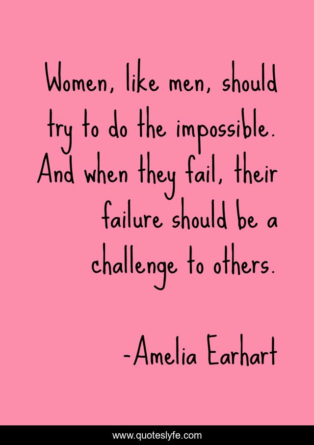 This page presents the quote "Women, like men, should try to do the impossible. And when they fail, their failure should be a challenge to others.". Author of this quote is Amelia Earhart. This quote is about challenge, men, women,.