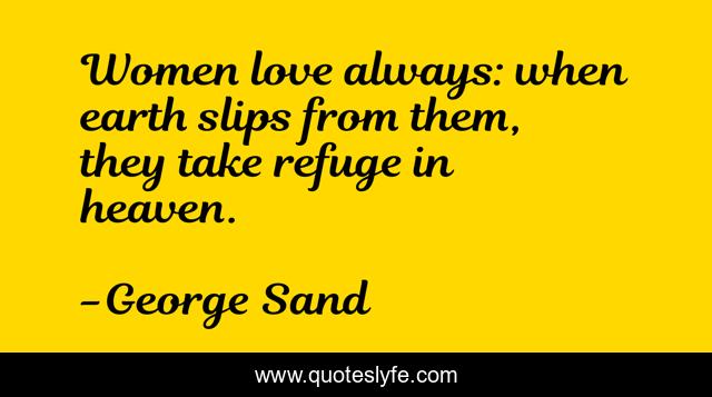 This page presents the quote "Women love always: when earth slips from them, they take refuge in heaven.". Author of this quote is George Sand. This quote is about earth, heaven, love, affection,.