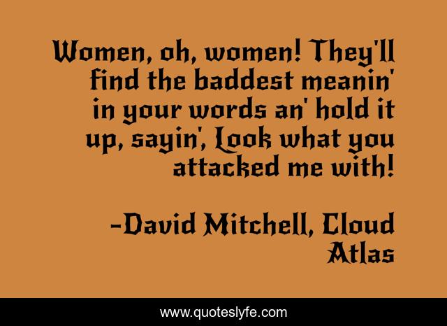 This page presents the quote "Women, oh, women! They'll find the baddest meanin' in your words an' hold it up, sayin', Look what you attacked me with!". Author of this quote is David Mitchell, Cloud Atlas. .
