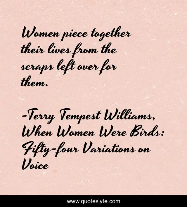 "Terry Tempest Williams, When Women Were Birds: Fifty-four Variations on Voice Quotes." Quoteslyfe.com, 2025. Mon. 08 Dec. 2025. <https://www.quoteslyfe.com/quote/Women-piece-together-their-lives-from-the-102223>.