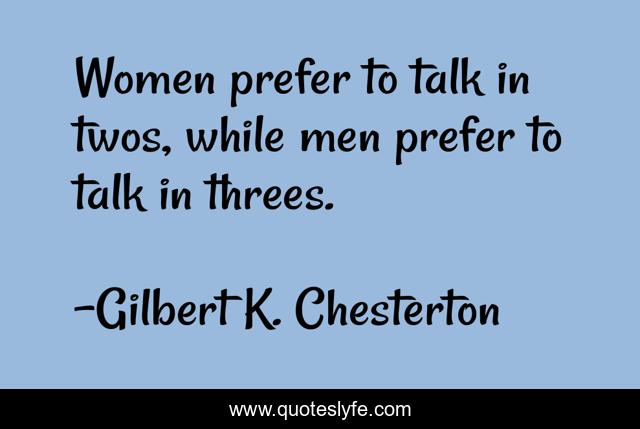 This page presents the quote "Women prefer to talk in twos, while men prefer to talk in threes.". Author of this quote is Gilbert K. Chesterton. This quote is about while, talk, women,.