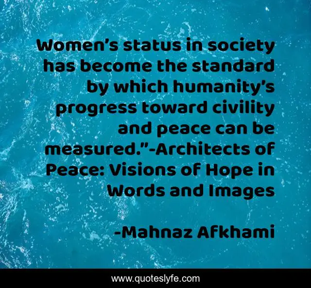 This page presents the quote "Women’s status in society has become the standard by which humanity’s progress toward civility and peace can be measured.”-Architects of Peace: Visions of Hope in Words and Images". Author of this quote is Mahnaz Afkhami. This quote is about society, peace, women-s-rights,.