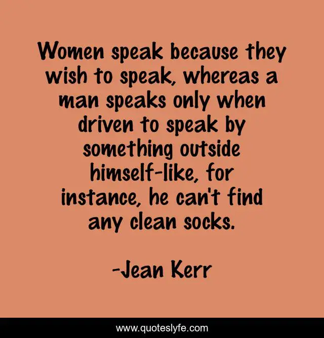 This page presents the quote "Women speak because they wish to speak, whereas a man speaks only when driven to speak by something outside himself-like, for instance, he can't find any clean socks.". Author of this quote is Jean Kerr. This quote is about humor, language, gender, men, socks, conversation, clothes, speaking, women,.