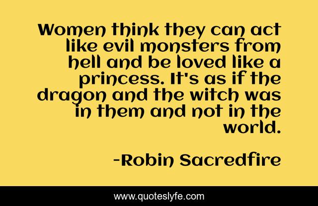 This page presents the quote "Women think they can act like evil monsters from hell and be loved like a princess. It's as if the dragon and the witch was in them and not in the world.". Author of this quote is Robin Sacredfire. This quote is about relationships, falling-in-love, love, what-is-love, love-story, dating, affection,.