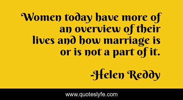 This page presents the quote "Women today have more of an overview of their lives and how marriage is or is not a part of it.". Author of this quote is Helen Reddy. This quote is about part, marriage, today,.