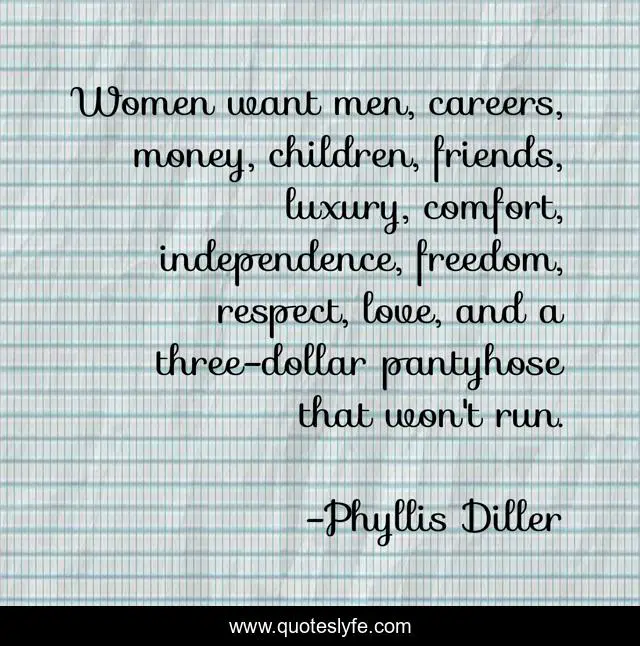 This page presents the quote "Women want men, careers, money, children, friends, luxury, comfort, independence, freedom, respect, love, and a three-dollar pantyhose that won't run.". Author of this quote is Phyllis Diller. This quote is about humor, women,.