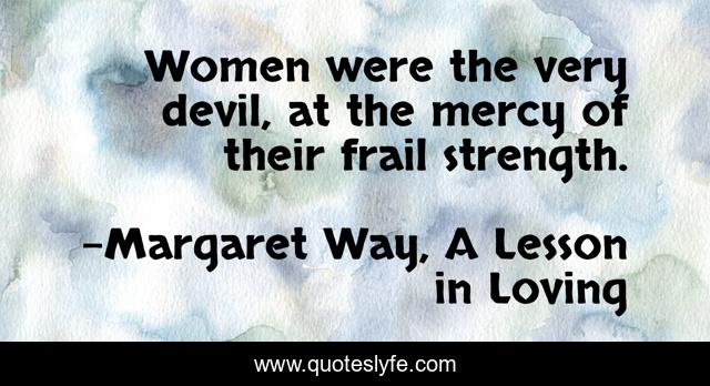 This page presents the quote "Women were the very devil, at the mercy of their frail strength.". Author of this quote is Margaret Way, A Lesson in Loving. This quote is about weakness, devil, weaknessity, frail, women,.