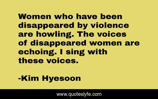 This page presents the quote "Women who have been disappeared by violence are howling. The voices of disappeared women are echoing. I sing with these voices.". Author of this quote is Kim Hyesoon. .